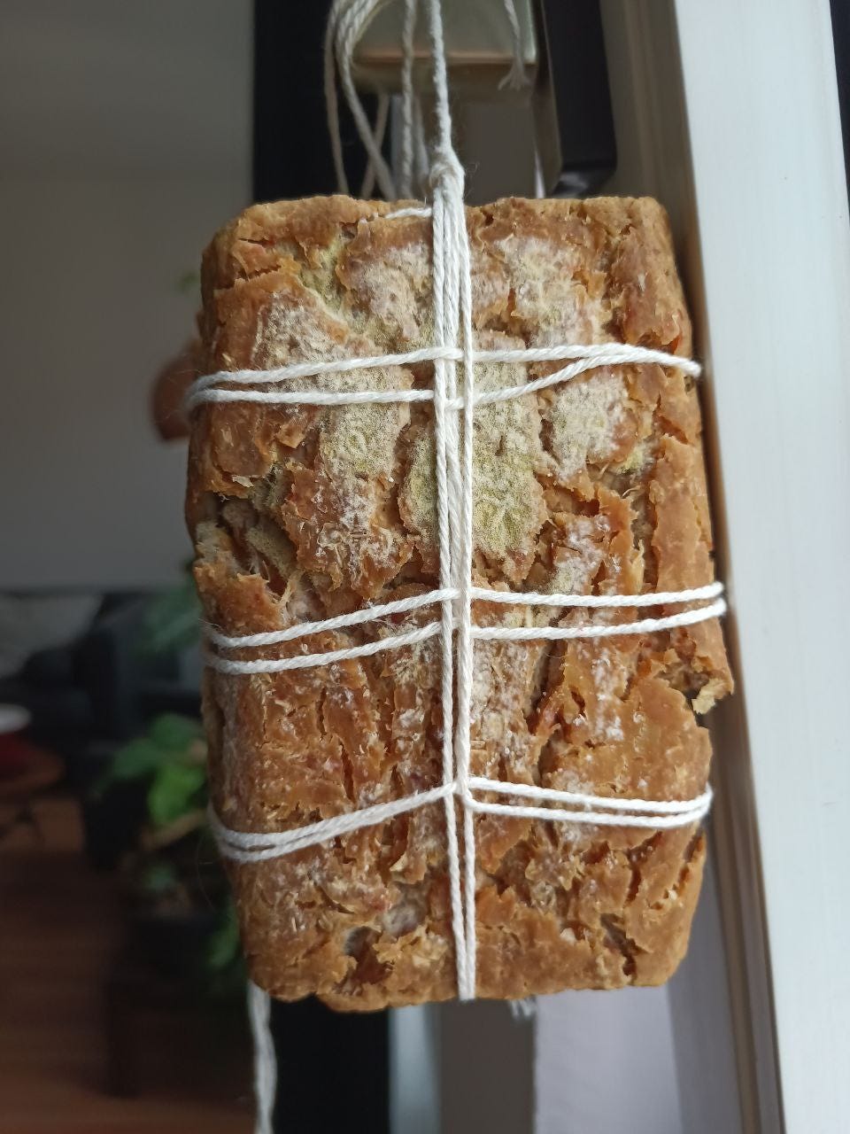 Hang the meju outside if you have a rain-protected area where they can be exposed to sunlight and lots of ventilation. It’s customary to also pack them with straw if you have open plastic net-mesh bags that you can hang bunches of straw in, or simply put them in an area close to bundles of straw. I live in an apartment so I just hung them near my window which is kept open a fraction most of the time. Now we wait—6 weeks.